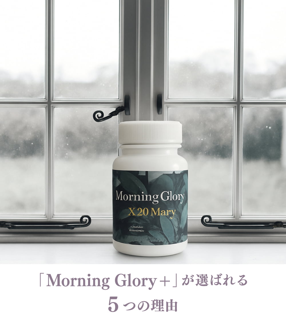 この“4種のGlory(栄光の)ブレンド”を1日2粒摂り続けることで、朝に溌剌と咲く朝顔の如く、夜に向け秘めて咲く夕顔の如く、